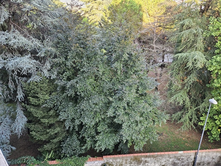 “Foto del parco privato di via Volta, che verrà in parte cancellato per la costruzione dei nuovi parcheggi, con relativo taglio di alberi di alto fusto”