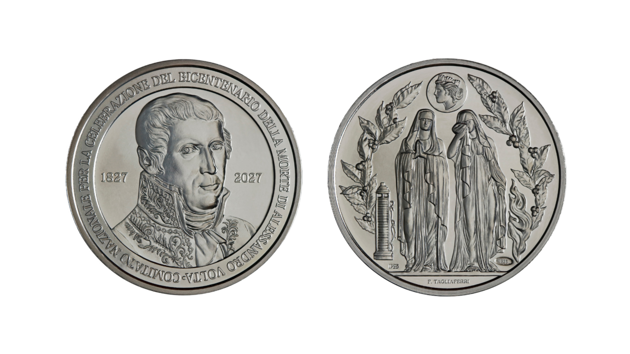 In occasione dei 199 anni dalla morte di Alessandro Volta, fisico e chimico di Como, il Comitato Nazionale per le celebrazioni voltiane e l’Istituto Poligrafico e Zecca dello Stato presentano il conio della medaglia ufficiale delle manifestazioni voltiane del 2027, anno del bicentenario. La medaglia è in argento e ha un diametro di 32 millimetri. Il dritto riporta Alessandro Volta, mentre il rovescio raffigura le due statue situate all’esterno del mausoleo di Alessandro Volta a Camnago Volta: la prima, in preghiera, rappresenta la fede; la seconda, piangente, la scienza. Le due figure sono affiancate dalla pila e da una fiamma che simboleggia il metano, a ricordare le conquiste di Alessandro Volta per l’umanità. Intorno compaiono due rami di alloro, il volto dell’Italia turrita e la firma dell’artista Francesca Tagliaferri.