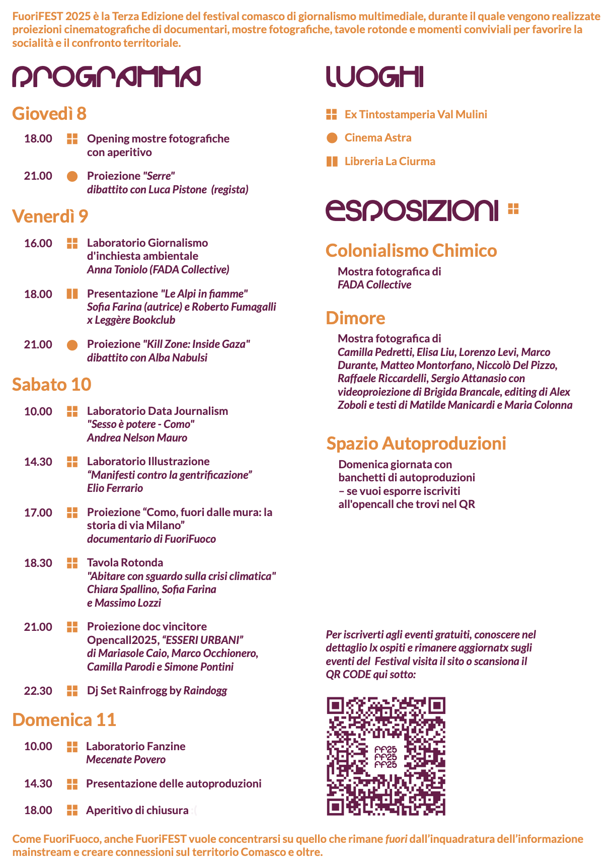 FuoriFest comunica che “essendo un luogo in ristrutturazione, la tintostamperia Valmulini non è un luogo del tutto accessibile, ma ci impegneremo per renderlo tale” e invita, nel caso ci fossero dubbi riguardo l’accessibilità, a scrivere direttamente al collettivo. FuoriFest consiglia, inoltre, di iscriversi alle presentazioni tramite EventBrite.