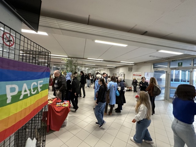Nell’atrio della scuola allestiti stand informativi. Tra gli altri, quelli del Marcelino Pan y Vino (attivo con progetti di sviluppo sociale in Perù), dell’associazione Interragire di Lurate Caccivio, della bottega equosolidale Koinè, dell’Avis olgiatese e dell’Anpi.