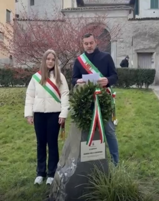 “Oggi assieme alla sindaca del Consiglio comunale dei ragazzi, in un ideale passaggio di generazioni affinché non si dimentichino questi orrori, posiamo assieme questa corona in ricordo di chi dai campi di sterminio nazifascista non è più tornato. Lo facciamo davanti a questo cippo recante questa scritta: “In segno di memore omaggio alle vittime dello sterminio e delle persecuzioni del popolo ebraico e dei deportati militari e politici italiani nei campi nazisti”. Questo momento  vuol essere un monito per non dimenticare mai questa parte drammatica del nostro passato di italiani ed europei. Ricordare e commemorare le vittime della Shoah non significa affatto trascurare altri genocidi, né tantomeno stabilire inutili “priorità” tra stermini e dolori di un popolo piuttosto che di altri popoli. La Shoah è stata la messa in pratica di una volontà di cancellare dalla faccia della terra persone e gruppi ritenuti inferiori”.