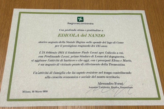 La storica “Edicola del Nando” di Lenno ha festeggiato la bellezza di 115 anni di attività. Oggi, martedì 10 marzo 2026, c’è stata la premiazione a Palazzo Lombardia.