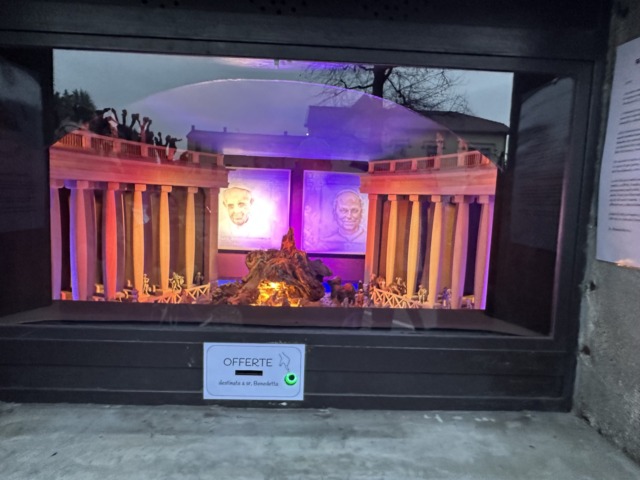 Ogni anno l’allestimento della natività si rinnova grazie all’opera di un gruppo di volontari. Lo scenario ideato e realizzato artisticamente per il Natale 2025 ambienta il presepio tra il colonnato di piazza San Pietro in Vaticano, sullo sfondo i volti di Papa Francesco e di Papa Leone, in più l’audio con le loro parole di pace.