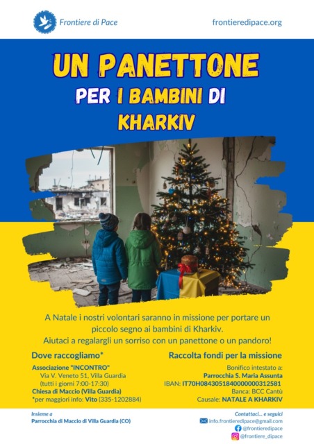 Il gruppo di volontari, con base nella parrocchia di Maccio, ha ideato una nuova iniziativa, appositamente per il periodo natalizio. Raccolta di panettoni e giocattoli per i piccoli di Kharkiv, grande città ucraina, più volte raggiunta da “Frontiere di Pace” e purtroppo sempre sotto attacco dell’esercito russo.