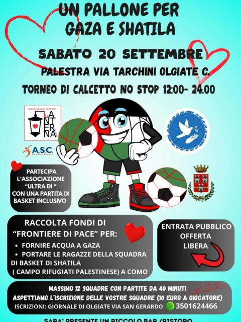 “Un pallone per Gaza e Shatila”, manifestazione sportiva e di solidarietà nella palestra comunale di Olgiate Comasco.