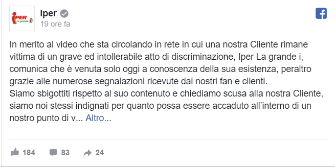 Le scuse di Iper sono arrivate anche direttamente sul post della giovane cinese. Ecco invece il post sulla pagina Facebook dell’azienda: