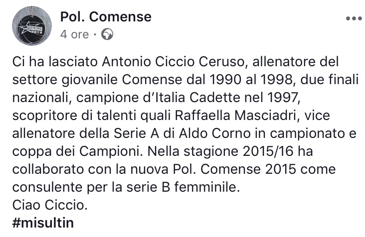 Per il Pol. Comense un lutto che apre il libro dei ricordi. Notizia riportata oggi sulla propria pagina Facebook dalla società cestistica. Coach Ceruso viene ricordato con commozione e affetto, illustrando un curriculum ricco di soddisfazioni sportive. Allenatore del settore giovanile dal 1990 al 1998, vantando due finali nazionali e il titolo di campione d’Italia Cadette nell’anno 1997.