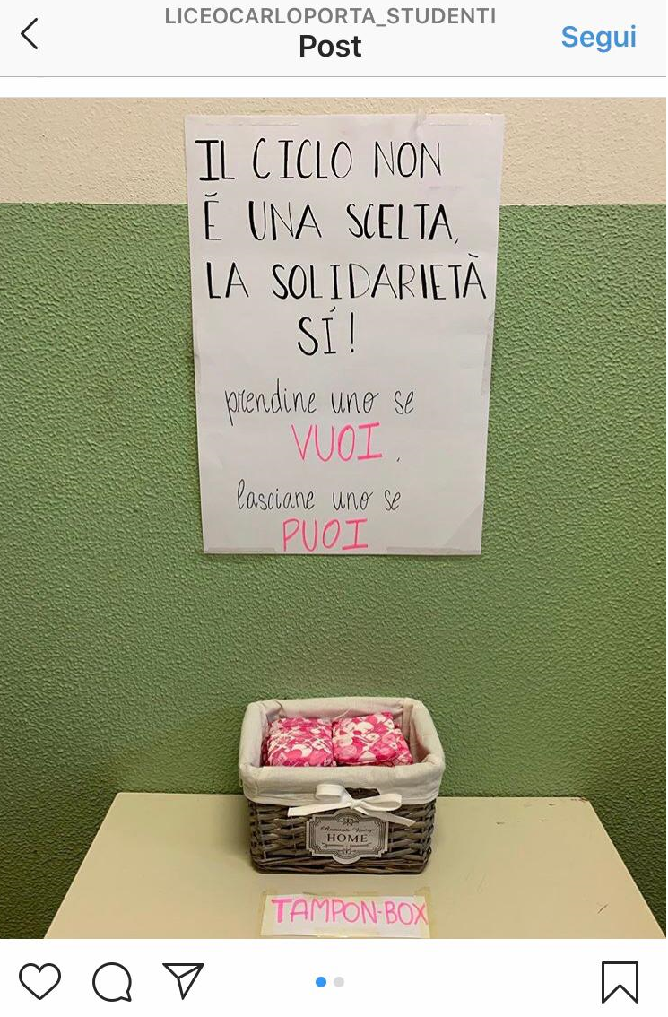 Lo slogan che la accompagna è chiaro: “Il ciclo non è una scelta, la solidarietà sì. Prendine uno se vuoi, lasciane uno se puoi”. L’idea è venuta ai rappresentanti di istituto degli studenti, Simone Pelucchi, Gaia Campora, Gaia Colombo e Jacopo Bellasio: “Abbiamo fatto un sondaggio interno per capire l’interesse, che si è dimostrato subito molto alto. Così abbiamo sistemato questa prima “tampon box” nei bagni femminili: solo nel primo giorno sono stati presi 10 assorbenti e lasciati 6. Il circolo virtuoso dovrebbe funzionare”.