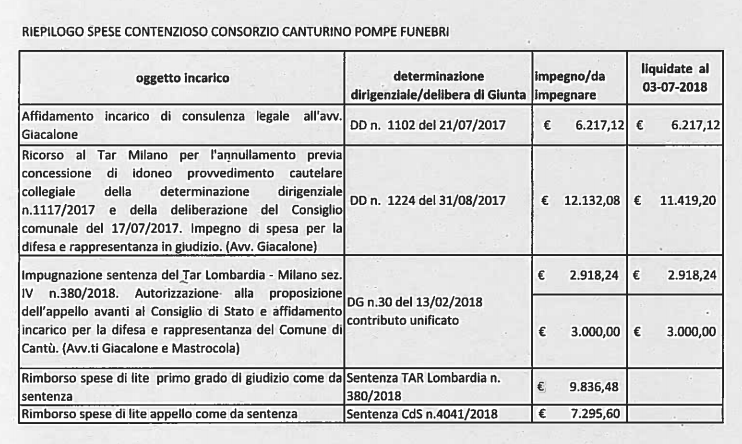 Per il ricorso al Tar Milano, la Giunta ha stanziato e pagato 18mila e 349 euro (ai quali però andranno aggiunti anche 9mila e 836 euro per il rimborso della spese di lite alla ditta Zanfrini per la causa davanti al Tar Milano. Il ricorso alla Corte dei conti è costato ai canturini 5mila 918euro. Si aggiungono 7.295,60 euro per il rimborso delle spese di lite sempre a favore della ditta Zanfrini”.