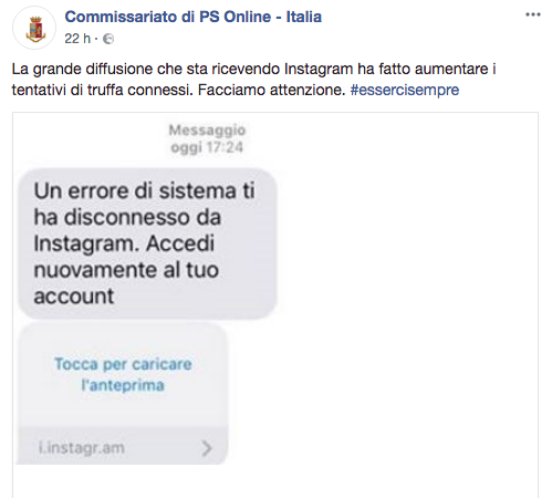 “Come andiamo ripetendo – sottolinea Giovanni D’Agata, presidente dell’associazione – bisogna prestare sempre la massima attenzione ad ogni comunicazione che giunge sui nostri dispositivi, perché dietro ad un messaggio che invita a controllare il proprio account si può nascondere un malintenzionato che è pronto a sottrarre i nostri dati”. È sempre bene ricordare che gli unici accessi sicuri ai social tra cui Instagram sono solo tramite l’app o il sito ufficiali. Occhio, quindi, ai messaggi come quello rilanciato dalla Polizia Postale per evitare di cadere nella trappola.