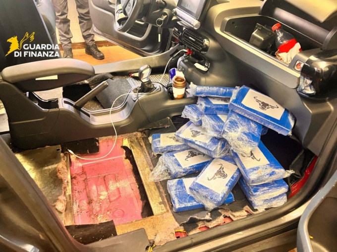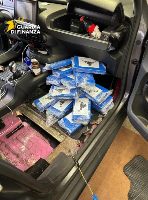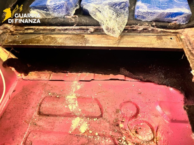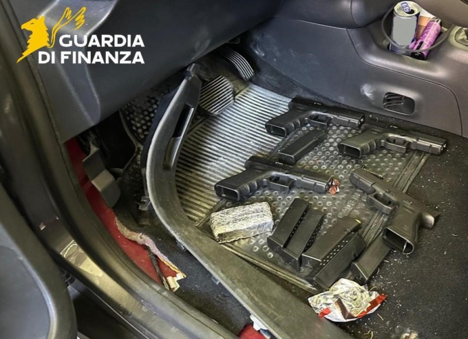 Alla luce degli elementi emersi e date le palesi incongruenze nelle dichiarazioni fornite, gli operanti hanno deciso di sottoporre anche l’utilitaria ad un più adeguato controllo tecnico, all’esito del quale sono stati scoperti, sotto il pianale dell’autovettura, due doppifondi contenenti: 18 panetti di sostanza stupefacente del tipo cocaina, per un peso complessivo di oltre 18 chilogrammi, quattro pistole Glock, sei caricatori, di cui due comprensivi di colpi e cinquanta proiettili sfusi.