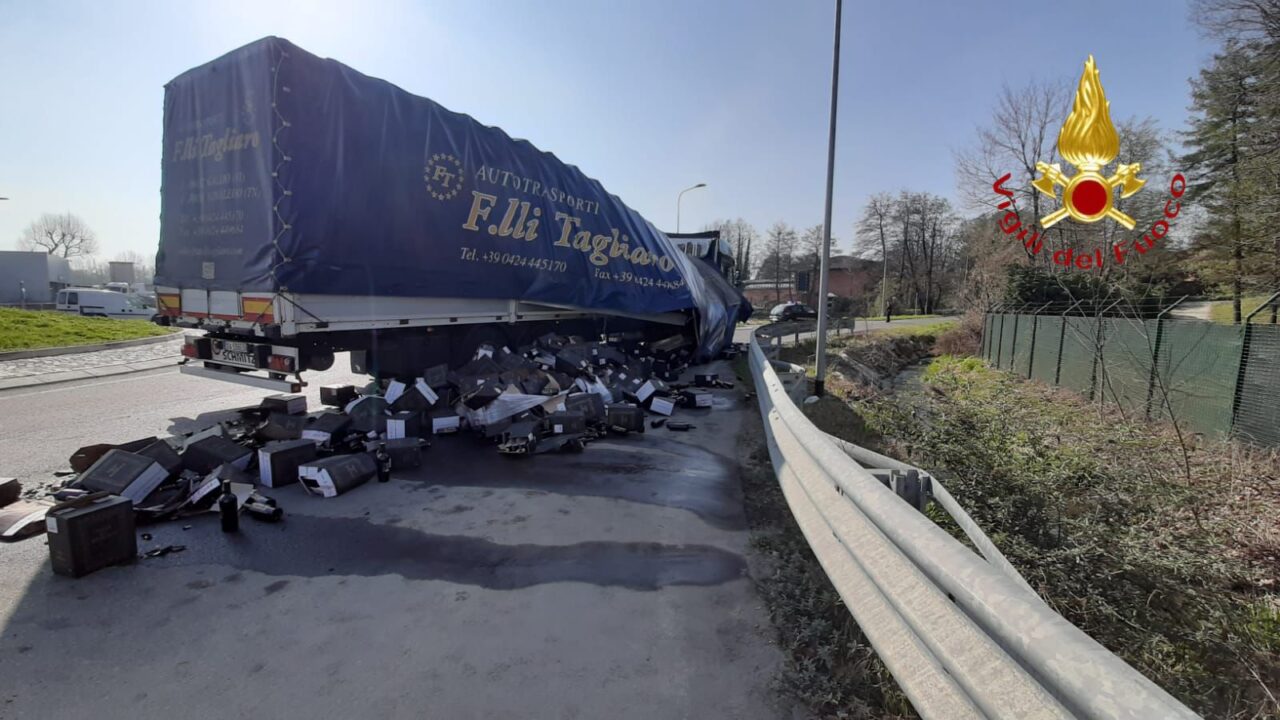 Autoarticolato esce di strada e perde il carico