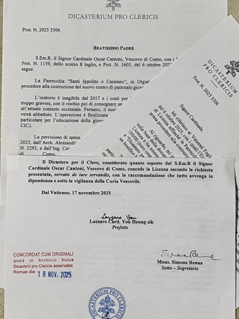 Ecco la lettera del Dicastero per il Clero, firmata lo scorso 18 novembre dal cardinale Lazzaro You Heung sik, prefetto del Dicastero per il Clero. “Signor Cardinale, mi riferisco ai documenti inviati lo scorso 8 luglio e il 6 ottobre 2025, con i quali l’Eminenza Vostra ha presentato a questo Dicastero domanda di Licenza affinché la parrocchia Santi Ippolito e Cassiano, in Olgiate Comasco, possa procedere alla costruzione del nuovo centro pastorale giovanile, c.d. oratorio. Al riguardo, mi premuro di comunicarLe che questo Ufficio della Sede Apostolica, sulla base della comunicazione presentata e dopo attento studio, ha accolto la domanda di licenza e ha emesso il relativo rescritto. Nell’auspicio che la summenzionata operazione giovi al bene di codesta Chiesa particolare, La saluto con sentimenti di viva cordialità e mi confermo con sensi di venerato ossequio”.
