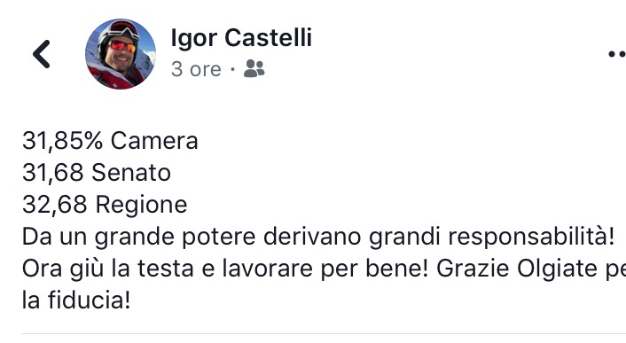 E dire che per Castelli, ultimata la conta dei voti leghisti iniziata ieri all’alba (boom anche a Olgiate Comasco), la giornata di oggi era iniziata serenamente. All’insegna del “bisogna saper vincere”, auspicando senso di responsabilità di fronte al bagno di folla votante per la Lega salviniana.