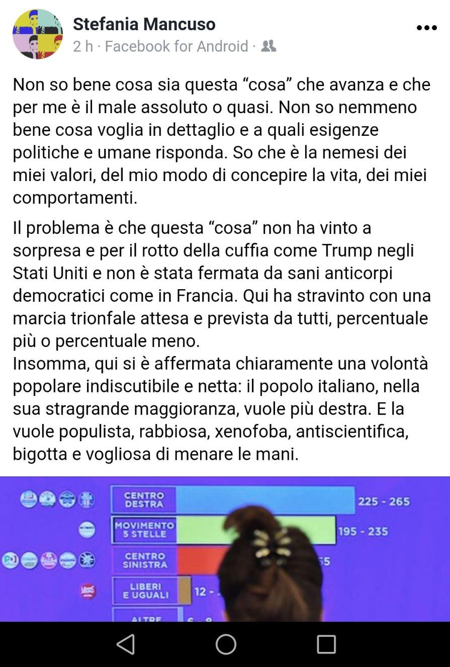 “Non so bene cosa sia questa “cosa” che avanza e che per me è il male assoluto o quasi”. Così inizia il post di Stefania Mancuso, pubblicato sulla propria pagina Facebook. Non farina del suo sacco ma parole che copiano e incollano una “fetta” di un articolo pubblicato dalla testata online Il Post. Che si chiude così: “Insomma, qui si è affermata chiaramente una volontà popolare indiscutibile e netta: il popolo italiano, nella sua stragrande maggioranza, vuole più destra. E la vuole populista, rabbiosa, xenofoba, antiscientifica, bigotta e vogliosa di menare le mani”.