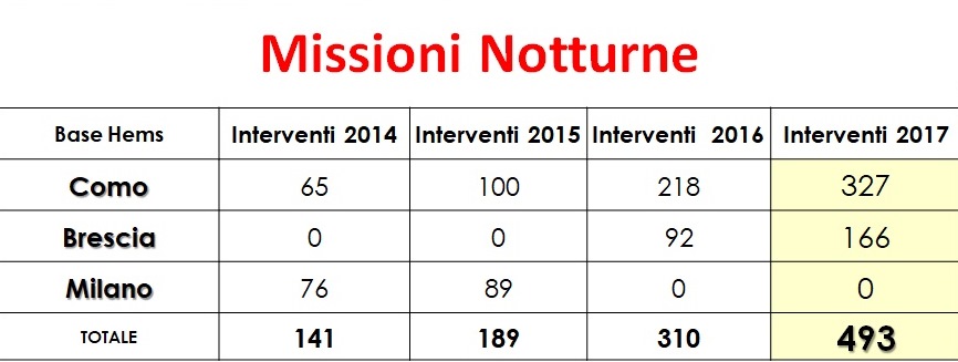 Il servizio di stanza a Como, che può contare su aeromobili ad ala rotante sempre più moderni ed efficienti – come l’attuale AW 139 -, è passato da una media di 70 interventi notturni all’anno a oltre 300 l’anno. Nel 2017 i voli notturni sono stati 327, 177 dall’inizio del 2018 alla metà di luglio. Attualmente gli interventi primari, ovvero quelli effettuati sul territorio, rappresentano l’80% dell’attività e i secondari, cioè quelli di pazienti critici da struttura sanitaria ad altra struttura sanitaria, sono il 20%.