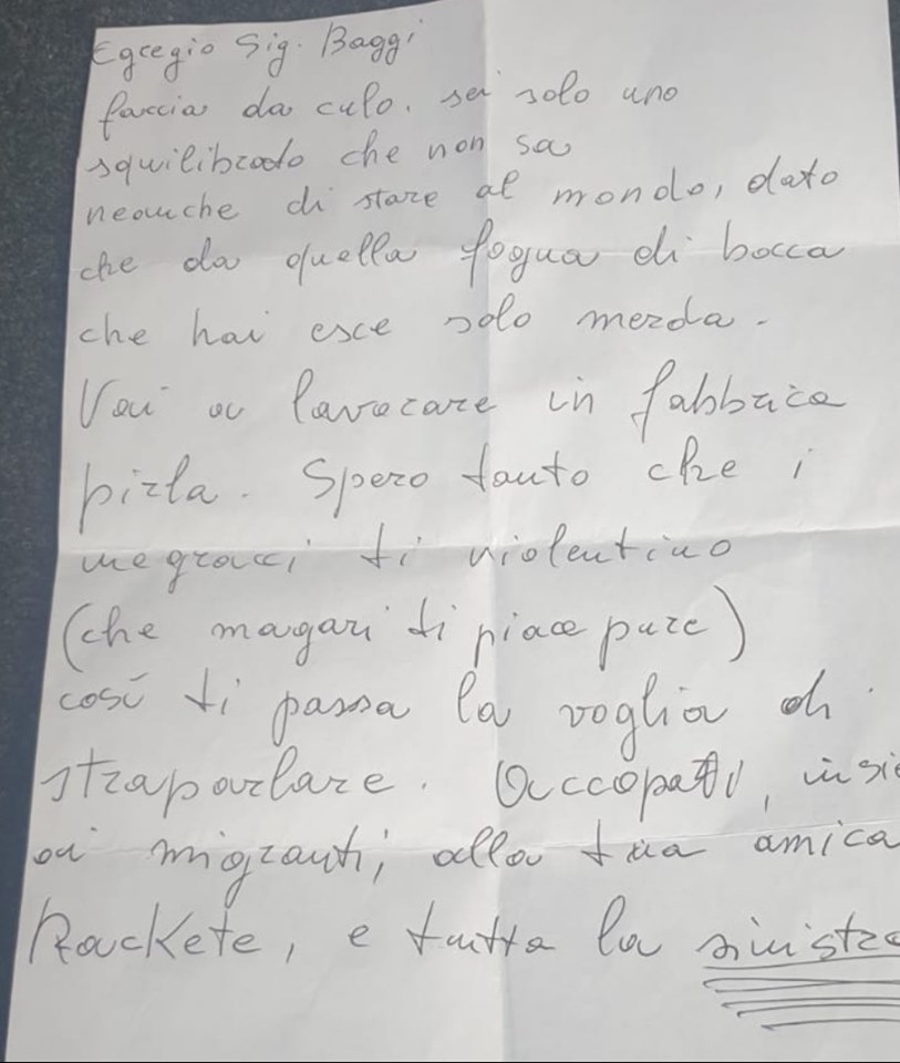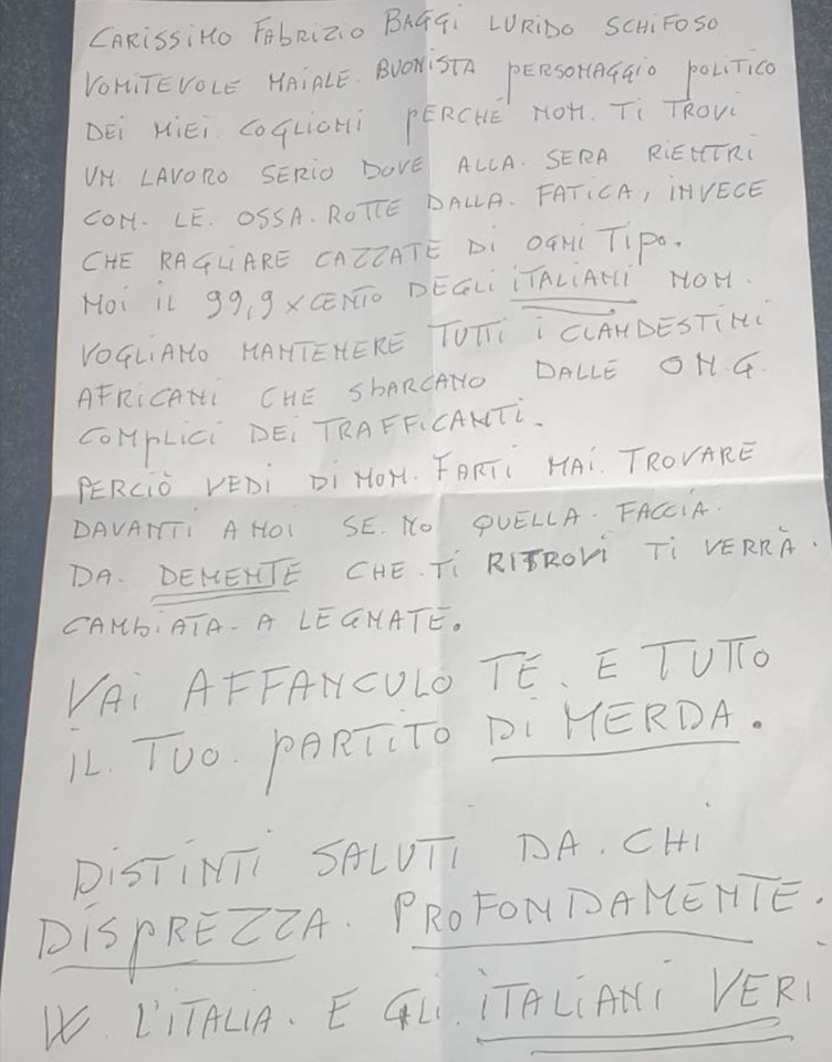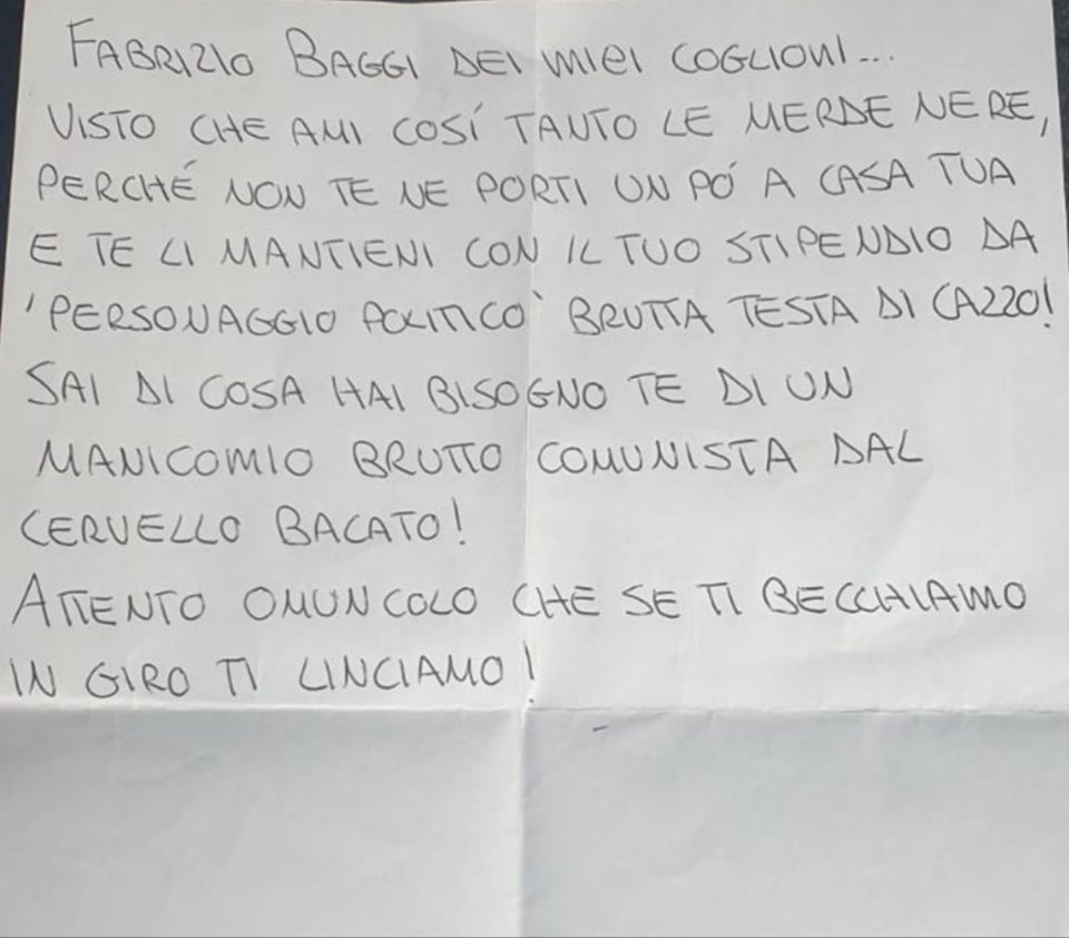 Baggi, nelle missive, viene definito “vomitevole maiale buonista” , il partito invece è “partito di m” e gli immigrati “m. nere”. Le minacce sono esplicite: “vedi di non farti mai trovare davanti a noi che la tua faccia se non quella faccia da demente che ti ritrovi ti verrà cambiata a legnate”, “attento omuncolo che se ti becchiamo in giro ti linciamo”. “Il repertorio – scrive in un comunicato Rifondazione Comunista – è il consueto dell’estrema destra: Fabrizio è in buona compagnia con ong e Carola Rackete come bersaglio degli anonimi xenofobi. Gli autori cercano di spacciarsi come voce del “99,9% degli italiani” nell’euforia che Salvini e Meloni hanno creato negli ambienti di estrema destra. Si tratta di minacce da non sottovalutare vista la presenza e l’aggressività neofascista in Lombardia e nel comasco. L’aggressione da parte di quattro squadristi a un lavoratore migrante nel comune di Tremezzina di poche ore fa è solo l’ultimo episodio”.