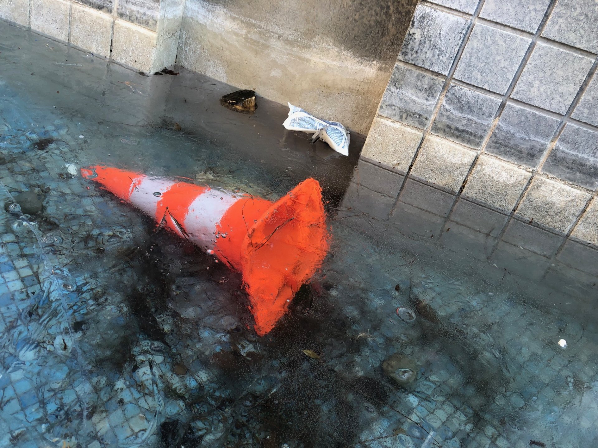 Fontana nel mirino dei maleducati, ricettacolo di immondizia: incastrato nell’acqua ghiacciata un birillo della segnaletica stradale. Un monumento all’inciviltà.