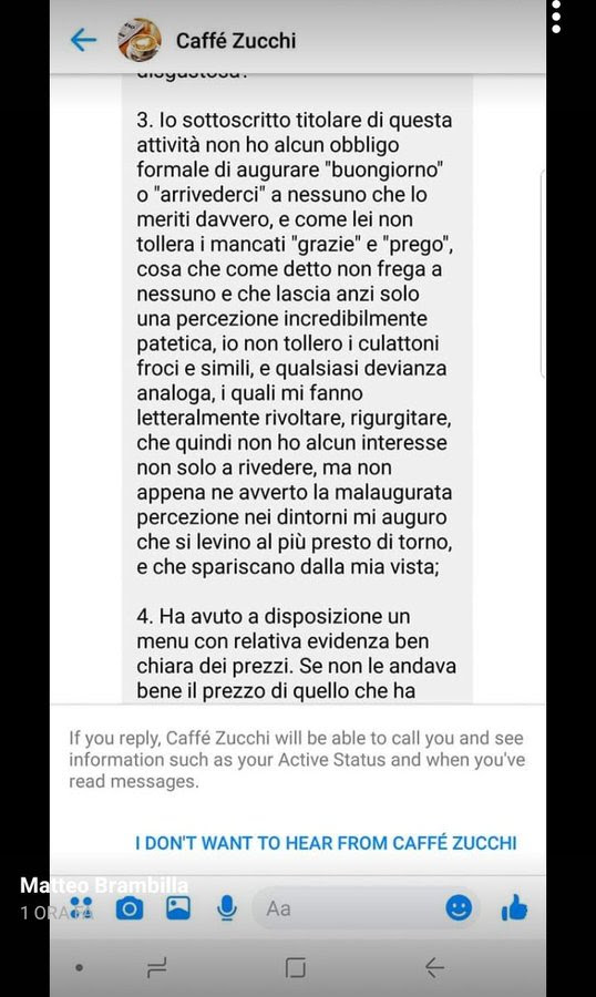 Una decina di giorni fa il 35enne Matteo Brambilla, insieme al fidanzato, ha ordinato un aperitivo al Caffè Zucchi di Monza. Poi Brambilla ha scritto una recensione negativa sul locale. Il titolare dell’esercizio commerciale ha rintracciato il cliente su Facebook per scrivergli messaggi con insulti omofobi.