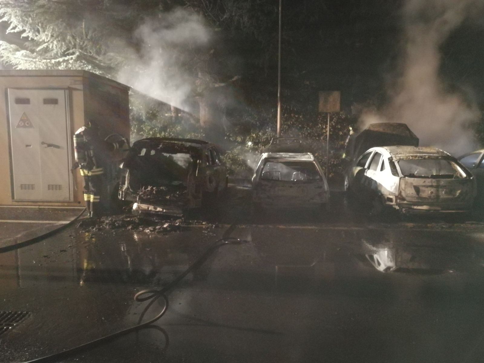 E’ successo intorno alle 3. Fiamme, esplosioni, paura. Sul posto, in via Tiziano Vecellio, si sono precipitati i Vigili del fuoco. I pompieri sono intervenuti per spegnere il rogo nel quale sono andate completamente distrutte quattro automobili. Intervento urgente con squadre dei Vigili del fuoco di Appiano Gentile e di Como.