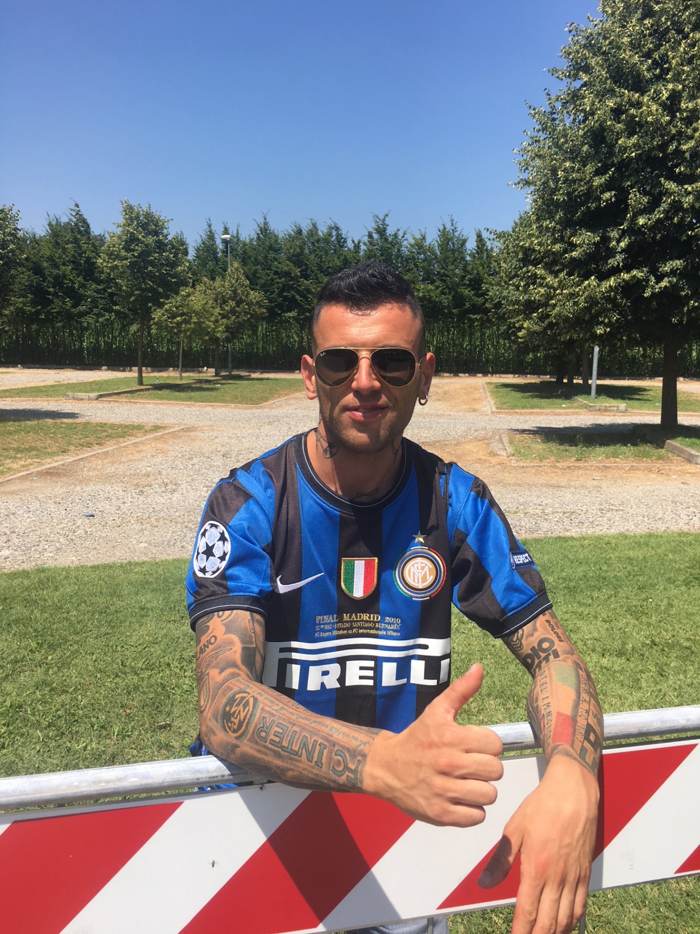 Cosa indigesta a Matteo Tommassoni, 30 anni, giunto ad Appiano appositamente da Fano. Trasferta di 420 chilometri. “Ho preso una settimana di ferie, sto in un b&b nella zona del Monte Sinai”, dice, avvicinandosi al taccuino con occhiali da sole, maglia nerazzurra e tatuaggi altrettanto interisti. “Qui hanno blindato tutto ma io resto. Vediamo cosa succede. Ho preso una settimana di vacanza dal lavoro, magari qualcosa si riuscirà a vedere. Certamente non mi piace un calcio blindato ai tifosi. Così sembra una guerra… I miei giocatori preferiti? Attualmente Skriniar, in generale Cambiasso, Materazzi ed Eto’o”.