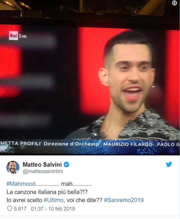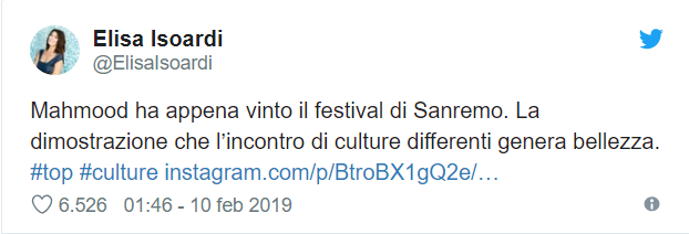 Mahmood è un ragazzo 26enne nato e cresciuto a Milano, una piccola esperienza a X Factor, il palco di Sanremo giovani e ora la consacrazione fra i big, sbaragliando l’ingombrante concorrenza del super favorito Ultimo, che si è parcheggiato al secondo posto con note polemiche. Più sportivi, invece, i colleghi di podio – i ragazzi de Il Volo – che si complimentano con lui e ne certificano il talento. Immancabile l’accenno di polemica a “causa” delle origini egiziane del padre del giovane, Mahmood però non ci sta e brucia sul nascere qualunque tentativo di focalizzarsi sulle sue origini straniere: “Sono italiano” lo rivendica con orgoglio. Anche perché, all’anagrafe, lui lo è. In bilico tra odio e amore verso quella complicata periferia sud milanese, che racconta nei suoi brani. Il ministro Salvini è intervenuto sulla questione, in seguito a questa vittoria inaspettata e, in totale opposizione con le sue dichiarazioni, la sua ex: Elisa Isoardi.