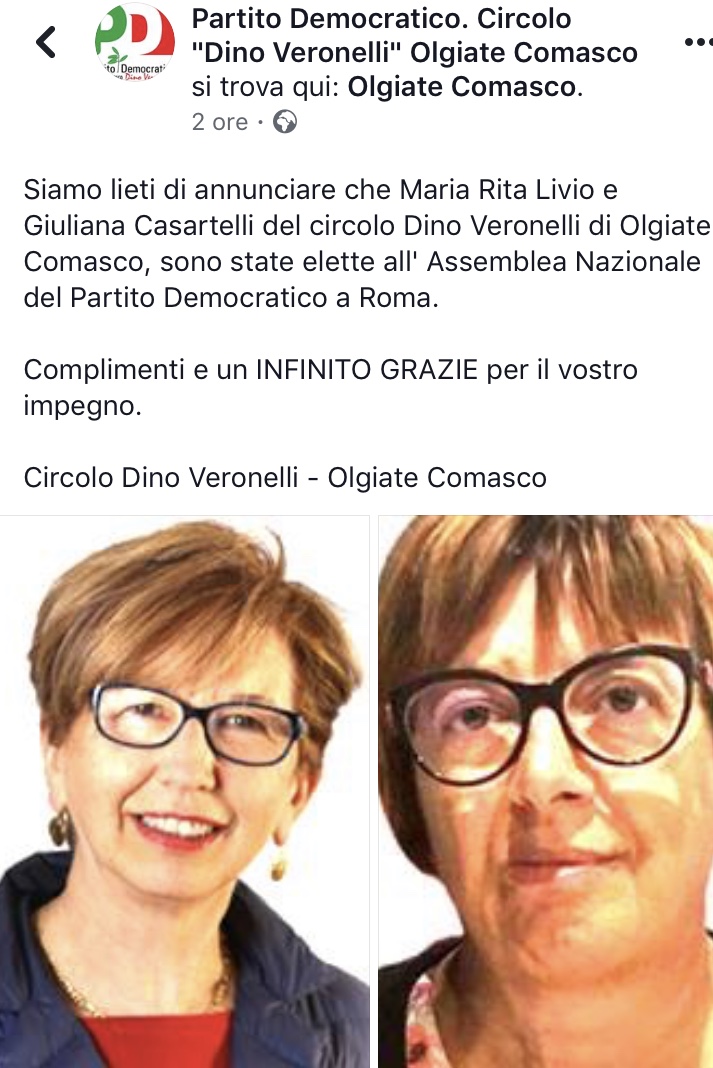 La novità viene evidenziata con entusiasmo dal circolo di Olgiate Comasco del Pd. “Siamo lieti di annunciare che Livio e Casartelli sono state elette all’Assemblea nazionale del Partito democratico a Roma. Complimenti e un infinito grazie per il vostro impegno”.