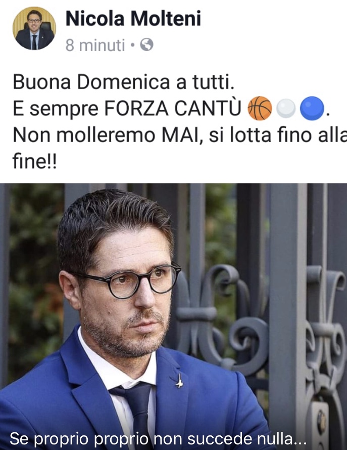 Tutta Cantù si interroga sul presente e il futuro della società di basket. C’è bisogno di un grande sforzo economico per garantire continuità. Un caso eclatante, che sta facendo parlare tutta Italia. E tra i tifosi, già mobilitati, anche l’appello di Nicola Molteni, sottosegretario impegnato ai massimi livelli di Governo a Roma. Oggi ha ribadito il proprio sostegno alla Pallacanestro Cantù, con un esplicito post su Facebook, invitando a stare vicino alla squadra, lottando fino alla fine.