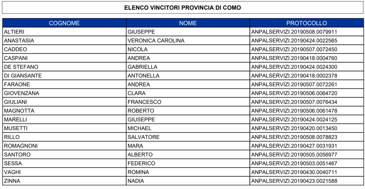Concorso Navigator: ecco i vincitori (e gli idonei) per la provincia di Como. Sono stati infatti pubblicati  oggi, martedì 25 giugno, sul sito dell’Anpal servizi gli elenchi dei vincitori del concorso che si è svolto tra il 18 e il 20 giugno a Roma 18-19-20 giugno a Roma e le graduatorie degli idonei, per ciascuna provincia.
