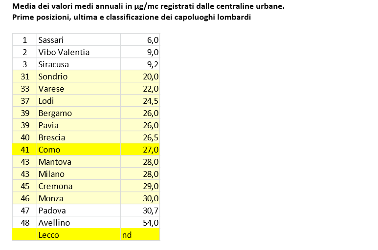 Como registra una media annua dei valori registrati dalle centraline urbane pari a 27 microgrammi per metro cubo (nel 2017 erano 24), ex aequo con Venezia. Si trova circa a metà strada tra i capoluoghi lombardi, comunque nella parte arretrata della graduatoria, considerato che Monza si piazza terz’ultima a livello nazionale con 30 microgrammi. Lecco non risulta valutabile. Di nuovo, la prima tra i capoluoghi lombardi è Sondrio, che malgrado la felice collocazione naturale, si piazza comunque al 31° posto, con 20 microgrammi. Anche qui sono molte le posizioni ex aequo, infatti la graduatoria è composta da sole 48 posizioni, cui si aggiungono 21 capoluoghi non valutabili.