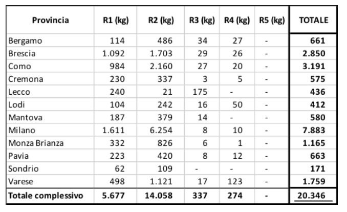 Nella tabella 1 sono riportate le quantità di RAEE gestite da Ecodom in ciascuna provincia della Lombardia.