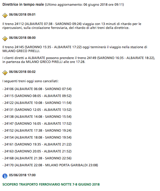 E Trenord intanto ricorda che domani è previsto anche uno sciopero. Dalle 22.00 di giovedì 7 giugno alle ore 6.00 di venerdì 8 giugno 2018, infatti, è previsto uno stop alla circolazione dei treni a causa di una agitazione da parte dei sindacati CUB Trasporti e USB Lavoro Privato che interessa il personale del Gruppo Ferrovie dello Stato Italiane e di Trenord. Durante lo sciopero quindi i servizi Regionali, Suburbani e Aeroportuali potranno subire ritardi, variazioni e/o cancellazioni. Fasce orarie di garanzia assicurate: viaggeranno regolarmente tutti i treni in partenza entro le ore 22.00 di giovedì 7 giugno e con arrivo a destinazione finale entro le ore 23.00. Sono possibili ripercussioni anche dopo la conclusione dello sciopero.