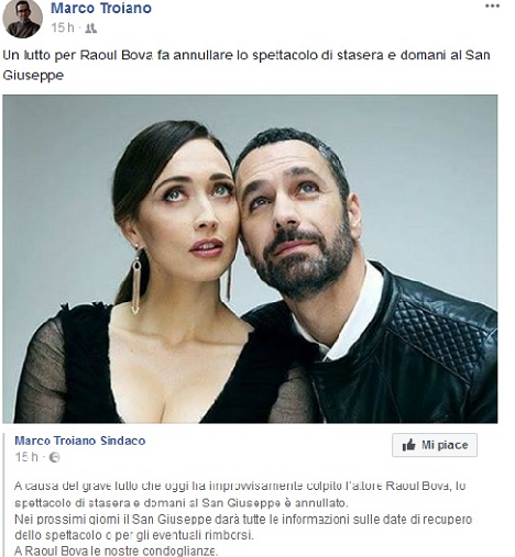 “La direzione del Teatro San Giuseppe di Brugherio comunica al gentile pubblico che a causa del grave lutto che ha improvvisamente colpito l’attore RAOUL BOVA, le previste repliche di DUE in scena oggi 8 e domani 9 Gennaio sono sospese. Nei prossimi giorni saranno fornite ulteriori informazioni circa le date nelle quali sarà recuperato lo spettacolo e circa le modalità per eventuali rimborsi. In questa triste circostanza, la direzione del Teatro esprime a Raoul Bova le più sentite condoglianze”.