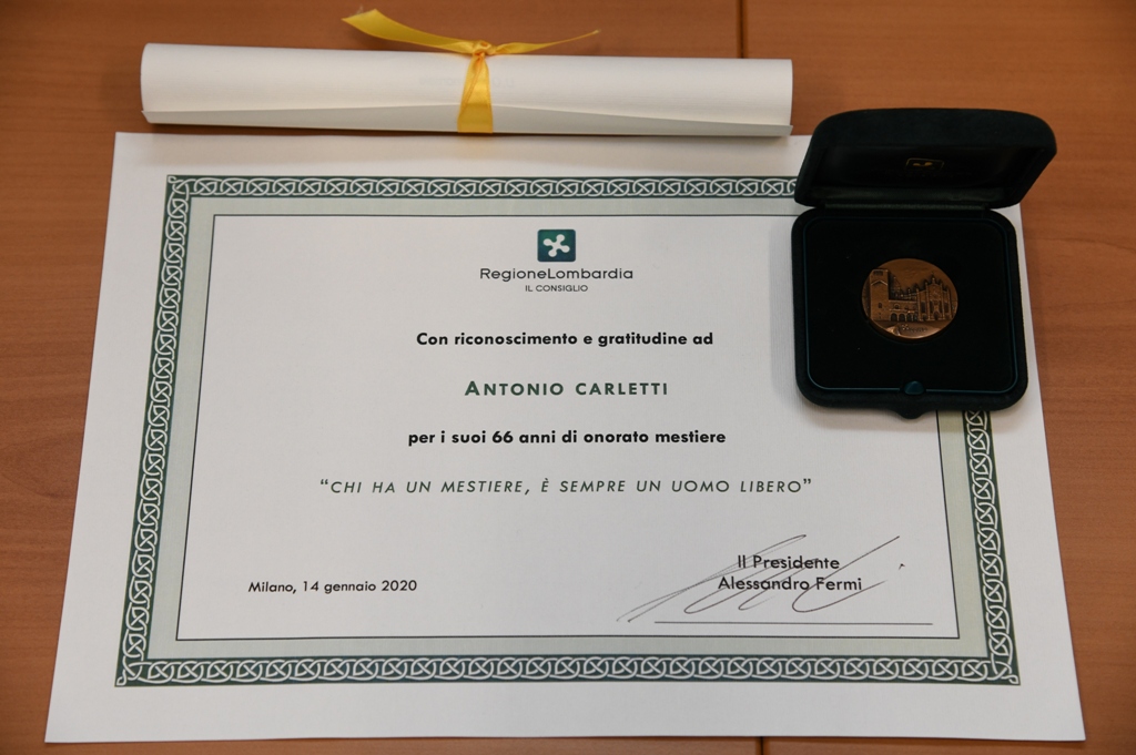 “Il riconoscimento vuole essere un premio all’impegno che ha contraddistinto Antonio Carletti in quasi 65 anni di lavoro. Un professionista che ha svolto la sua professione con competenza e soprattutto con grande passione. Carletti è un esempio per tutti noi e in particolare per i nostri giovani per aver sempre creduto nell’importanza di imparare un mestiere e di svolgerlo con dedizione, mantenendo saldi alcuni valori come quello della famiglia che oggi lo ha accompagnato per festeggiare insieme l’atteso traguardo della meritata pensione”. Lo ha sottolineato il presidente del Consiglio regionale Alessandro Fermi che questa mattina a Palazzo Pirelli ha accolto Antonio Carletti, accompagnato nell’occasione dalla moglie e dai due figli. Premiato con la consegna di un attestato e una medaglia del Consiglio regionale per la sua lunga e intensa carriera: sull’attestato è riportata la frase “chi ha un mestiere è sempre un uomo libero”.