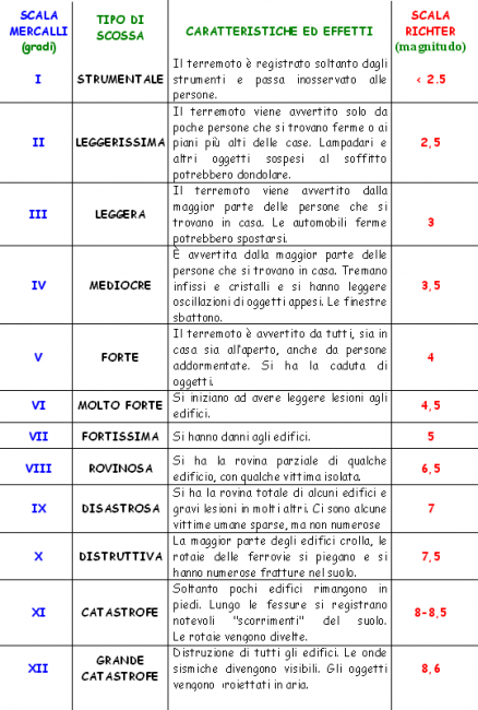 ECCO LA TABELLA DI COMPARAZIONE FRA SCALA RICHTER E MERCALLI, PER FARSI UN’IDEA DELLE INTENSITA’: