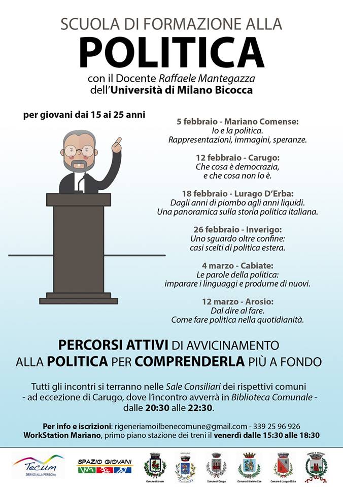 Il 5 febbraio alle 20.30 ri-parte da Mariano Comense la seconda edizione della “Scuola di Formazione alla Politica”, promossa dai Comuni di Mariano, Carugo, Cabiate, Arosio, Inverigo, Lurago d’Erba.