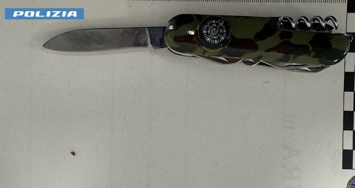 L’ispezione ha permesso di rinvenire appunto nella tasca destra dei pantaloni della tuta che indossava, un coltello multiuso con la lama di sette centimetri circa di cui il giovane non ne ha giustificato il possesso.