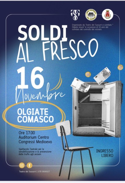 In occasione dei dieci anni di attività, il Controllo del vicinato mette in campo uno sforzo in più proprio nell’ottica della prevenzione. Domenica 16 novembre, alle 17 al Medioevo, lo spettacolo con gli attori del “Teatro dei Sussurri”. In scena “Soldi al fresco!”, con una trama divertente e al tempo stesso istruttiva per aiutare a prevenire le truffe.