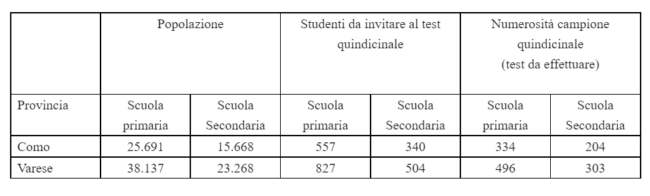 Ats spiega: “Nella fase di avvio, circa due mesi e che riguarderà anche l’attività in programma domani, i test saranno somministrati da personale sanitario di ATS nella sede scolastica, che provvederà poi ad inviare i campioni al laboratorio dell’ASST Sette Laghi di Varese. L’adesione avverrà su base volontaria e a seguito di sottoscrizione del consenso informato da parte dei genitori o tutori legali. La partecipazione non sarà in alcun modo vincolante per l’accesso a scuola. L’esito del test salivare, reso disponibile sul fascicolo sanitario elettronico, verrà segnalato nel sistema di sorveglianza e, in caso di positività, verranno disposte le necessarie misure di contenimento del contagio, senza ulteriori test di conferma. Il monitoraggio con test salivare rappresenta una misura di sanità pubblica preventiva volta a ridurre la circolazione del virus e limitare la conseguente applicazione di provvedimenti quali isolamenti, quarantene e didattica a distanza. ATS Insubria provvederà, in accordo con l’ufficio scolastico territoriale, ad individuare le “scuole sentinella” da invitare al test nel periodo ottobre 2021-maggio 2022 sulla base dei parametri numerici provinciali definiti nel “piano per il monitoraggio della circolazione di SARS-COV-2 nelle scuole primarie e secondarie di primo grado”, di seguito riportati: