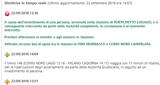 “A causa dell’investimento di una persona avvenuto nella stazione di Portichetto-Luisago e il conseguente intervento da parte delle Autorità competenti – si legge sul sito di Trenord – la circolazione è al momento interrotta. Prestare attenzione ai monitor e agli annunci in stazione. Attivato il servizio bus di spola tra le stazioni di Fino Mornasco e Como Nord Camerlata”.