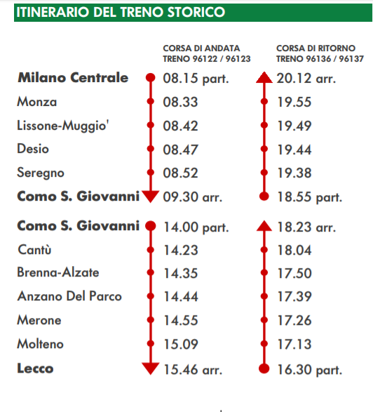 Si tratta di itinerari turistici al Lago di Como viaggiando su un treno storico con carrozze “Centoporte” degli anni ‘30, locomotiva elettrica d’epoca tra Milano e Como, locomotiva a vapore Gr. 740 da Como a Lecco. Da Como è possibile proseguire l’itinerario con la Navigazione Lago di Como (pontile a circa 1 km dalla stazione di S. Giovanni). Arrivando in battello fino a Varenna, è poi possibile utilizzare un treno regionale Trenord e riprendere il treno storico a Lecco (QUI INFO PRENOTAZIONE).