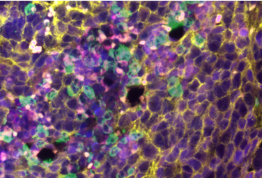 Il segreto lo ha scoperto una giovane scienziata italiana, Arianna Calcinotto, parte del gruppo internazionale di ricercatori guidato dal Prof. Alimonti. Gli scienziati, avvalendosi di collaborazioni nel Regno Unito e in Italia, hanno rilevato come elevati livelli di interleuchina 23 (IL23) fossero presenti nel sangue e nei tumori della maggior parte dei pazienti resistenti alla terapia anti-androgenica. “Ci siamo accorti – ha spiegato Calcinotto – che il rilascio di IL23 nel tumore è dovuto ad un tipo particolare di cellule del sistema immunitario (le cellule mieloidi), le quali in questo modo conferiscono resistenza alla terapia, promuovendo la sopravvivenza e la proliferazione delle cellule prostatiche tumorali”. Cellule mieloidi (in verde) infiltranti il tessuto tumorale prostatico (in giallo) in una lesione tumorale metastatica da paziente resistente alla terapia ormonale (trattamento con enzalutamide). Immagine prodotta dal team del Prof. Johann de Bono, UK.