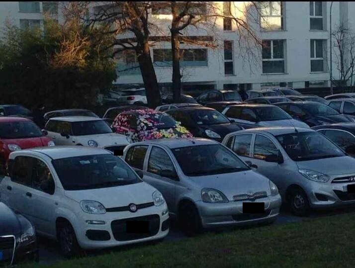 La donna, essendo una pendolare delle Ferrovie Nord Milano, con la macchina così addobbata ha raggiunto il parcheggio della stazione di Mariano Comense. E nemmeno a sottolinearlo la sua auto spicca su tutte e colora questa già bellissima giornata di sole.