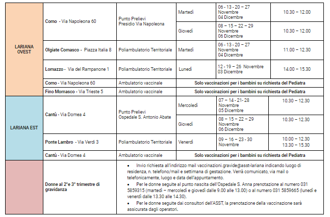 Si comincia domani, martedì 6 novembre, nei Poliambulatorio di via Napoleona a Como e a Olgiate Comasco e si proseguirà in queste strutture e nelle altre indicate nel prospetto fino al 6 dicembre. L’Asst fornirà, attraverso la Farmacia aziendale, il vaccino antinfluenzale ai medici di famiglia e alle residenze sanitarie per anziani e persone disabili oltre che ai detenuti e al personale che opera nella Casa Circondariale di Como. Inoltre, l’Asst ha avviato la campagna interna per la vaccinazione degli operatori aziendali e proporrà la vaccinazione ai pazienti cronici in carico agli ambulatori e servizi dell’Asst, come ad esempio i pazienti dializzati, e a quelli ricoverati nelle strutture ospedaliere di San Fermo della Battaglia, Cantù e Mariano Comense. Anche agli adulti (familiari, care giver, ecc.) a contatto con le categorie maggiormente a rischio, che con la vaccinazione contribuiscono a proteggere i propri cari, il vaccino viene offerto gratuitamente.