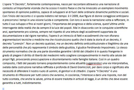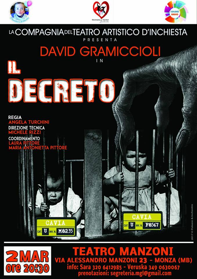Come detto il primo evento del gruppo sarà dedicato, ancora una volta al delicato tema dei vaccini. Tema che in questi giorni è entrato anche nella campagna elettorale per le prossime elezioni. Il gruppo ha scelto di proporre la rappresentazione intitolata “Il decreto. E’ un’ opera inerente la lex 119/2017 sull’obbligatorietà vaccinale. L’evento è previsto al Teatro Manzoni di Monza, in via Alessandro Manzoni, 23 per una durata di circa 135’. L’evento di David Gramiccioli è presentato dal Teatro Artistico d’inchiesta.