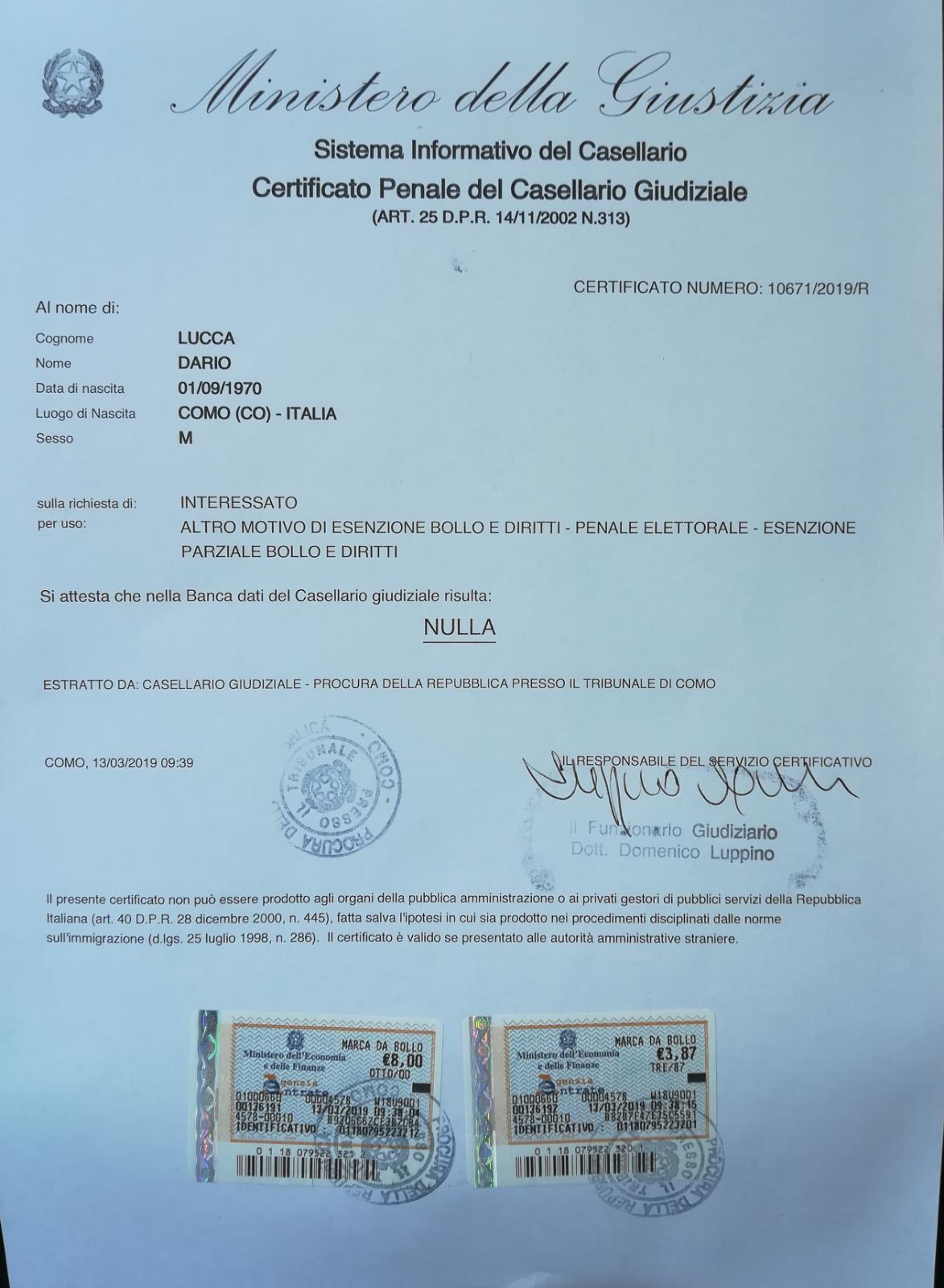 I candidati devono presentare il casellario giudiziario penale con tanto di marche da bollo