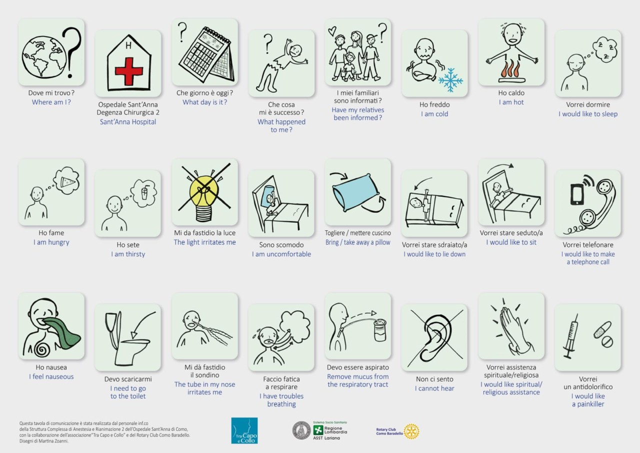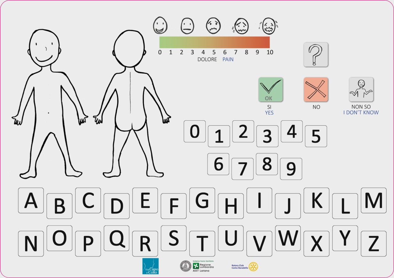 Realizzate su supporto rigido, lavabile e disinfettabile, le tavolette sono stampate fronte/retro a colori. Da un lato presentano icone intuitive, in italiano e in inglese, che rappresentano i principali bisogni assistenziali (come caldo, freddo, fame, sete, dolore, o anche togliere/mettere il cuscino) e le domande più ricorrenti (ad esempio: dove mi trovo? Che giorno è oggi? Cosa mi è successo?). Dall’altro lato sono riportati l’alfabeto, i numeri, le opzioni “sì”, “no”, “non so”, la rappresentazione del corpo umano e la scala del dolore (VAS). Anche attraverso semplici cenni, il paziente può così indicare con precisione le proprie necessità.