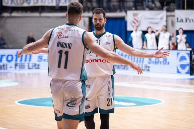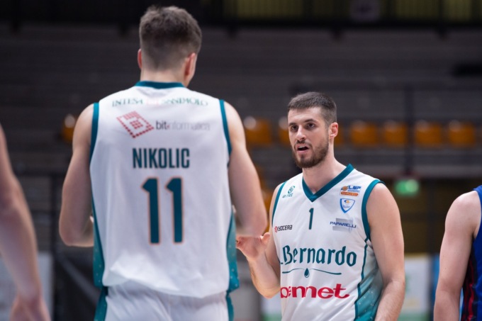 Quarta tripla di Leggio in apertura, a cui risponde Severini (66-57). Nikolic, Stefanelli e Berdini spingono i locali sul 75-59 del 35’. L’Acqua S. Bernardo amministra e vince per 86-66. Debutto stagionale per Greppi. Doppia-doppia per Nikolic con 28 punti e 12 rimbalzi (45 di valutazione).