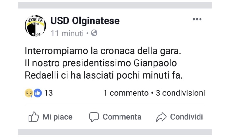 E’ la stessa società calcistica a segnalarlo sul proprio profilo Facebook: “Interrompiamo la cronaca della gara. Il nostro presidentissimo Gianpaolo Redaelli ci ha lasciati pochi minuti fa”.