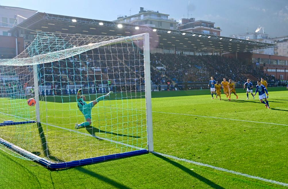 Da Cunha trasforma il penalty e porta avanti il Como (foto di Giancarlo Favaro)